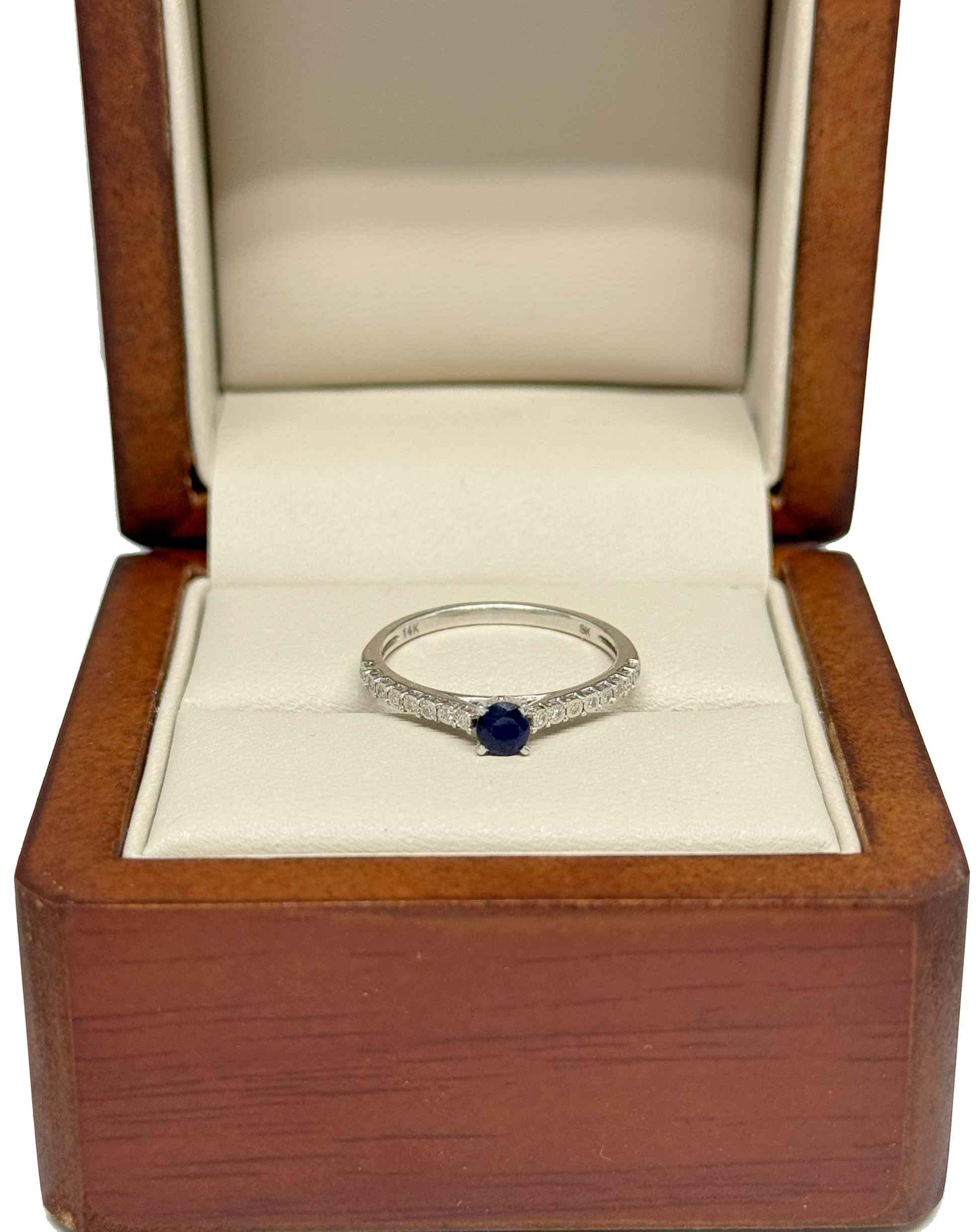 Este anillo de compromiso en oro blanco de 14K es una pieza que combina lo clásico con lo inesperado: un zafiro natural redondo como piedra central, de un azul intenso y atemporal, acompañado por delicados diamantes naturales (.05cts) en el brazo, que añaden un brillo sutil y sofisticado.