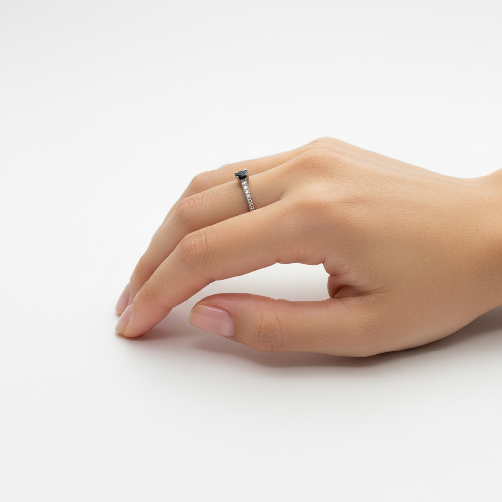 El contraste entre el tono profundo del zafiro y la luminosidad de los diamantes crea una joya refinada, con personalidad, ideal para quienes buscan un anillo de compromiso distinto, pero igualmente eterno.